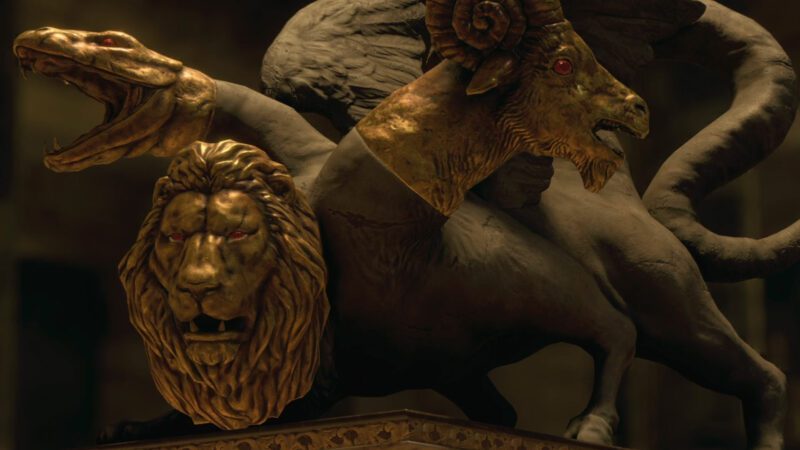 Durchquert ihr die Große Halle komplett, erwartet euch am Ende eine große Statue, die eine Chimäre abbildet. Allerdings scheinen die dazugehörigen Köpfe zu fehlen. Bei einer Chimära handelt es sich um ein Mischwesen aus Löwe, Ziege und Schlange. Somit suchen wir einen Löwenkopf, einen Ziegenkopf und einen Schlangenkopf.