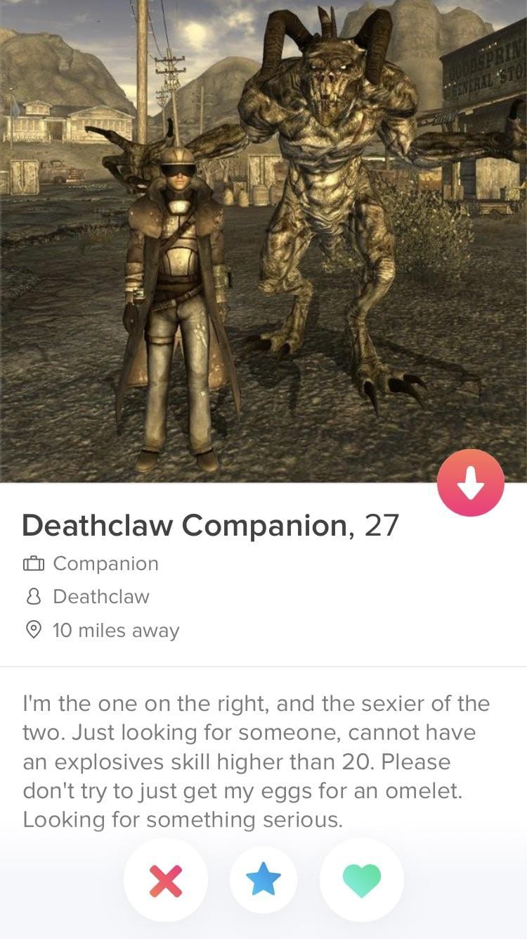Falls du denkst, dass die Todeskralle zu dir und deinen Vorstellungen passt, dann melde dich doch gerne bei der Kreatur. Ihr findet sie in der Tinder-App unter dem Namen "Deathclaw Companion". Sie ist übrigens 27 Jahre alt.
