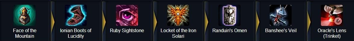 Im Late Game werdet ihr eine wahre Schildmauer sein. Ionische Stiefel geben euch die nötige Abklingzeitverringerung (CDR) um eure Skills häufiger einsetzen zu können. Alternativ könnt ihr  Stiefel der Beweglichkeit für stärkeres Roaming oder Ninja-Tabi gegen AD-lastige Gegner einbauen. Der Sehende Rubinstein erklärt sich von selbst, als Support seid ihr dafür verantwortlich genügend Wards auf der Map zu platzieren. Das Amulett der eisernen Solari verleiht euch nicht nur eine Aura mit guten Statuswerten, die Active verringert auch den gegnerischen Burst sobald ein Teamkampf beginnt. Randuins Omen liefert viel HP und Rüstung, dazu kommt der AoE Slow der Active, der das gegnerische Positioning erschweren kann. Zu guter Letzt baut ihr entweder den Schleier der Todesfee, wenn euer Gegner viel AP Schaden verursacht und das Gefrorene Herz, wenn das Gegnerteam eher AD-lastig ist.