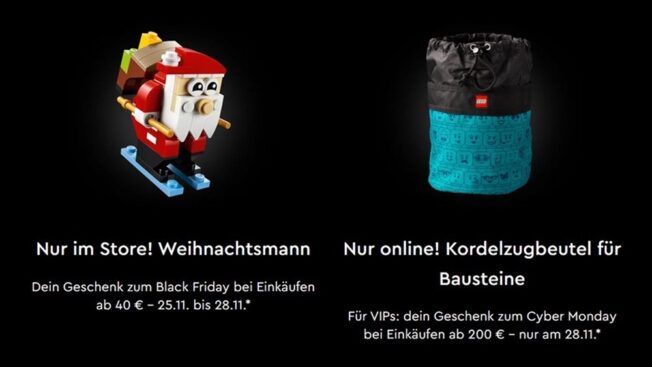 Unabhängig davon erhalten alle Käuferinnen und Käufer zwischen dem 25. und dem 28. November ab einem Einkaufswert von 170 Euro das Produkt Weihnachtselfen-Szene (40564) und ab 250 Euro das 5-teilige Set Hommage an LEGO House (40563) gratis dazu.