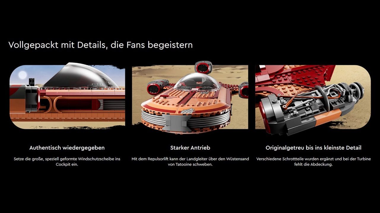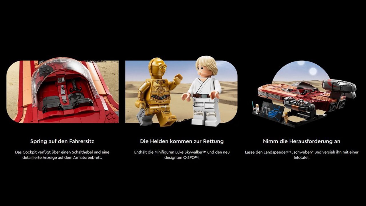 In der Vergangenheit legte LEGO mit dem Landspeeder den Fokus aufs Spielen. Kleine Heldinnen und Helden schlüpften in die Rolle des jungen Luke und erkundeten den Wüstenplaneten Tatooine. Das Modell von 2022 versteht sich mit seiner Altersempfehlung von 18+ eher als Ausstellungsstück und Hommage an „Star Wars: Eine neue Hoffnung“.