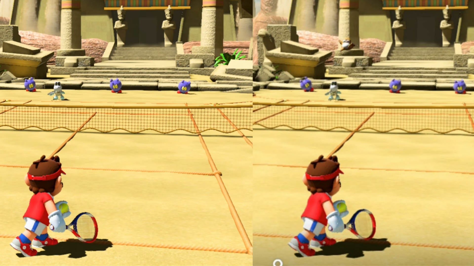 Zudem sieht Mario Tennis Aces im Dock ein wenig schärfer aus, die Texturen wirken weniger verschwommen. Das bezieht sich auf einzelne Matches oder beispielsweise die Weltkarte. Das Netz auf dem Tennisplatz ist beispielsweise besser sichtbar im Dock. Insgesamt ist der Unterschied auf dem kleinen Bildschirm aber kaum zu erkennen.