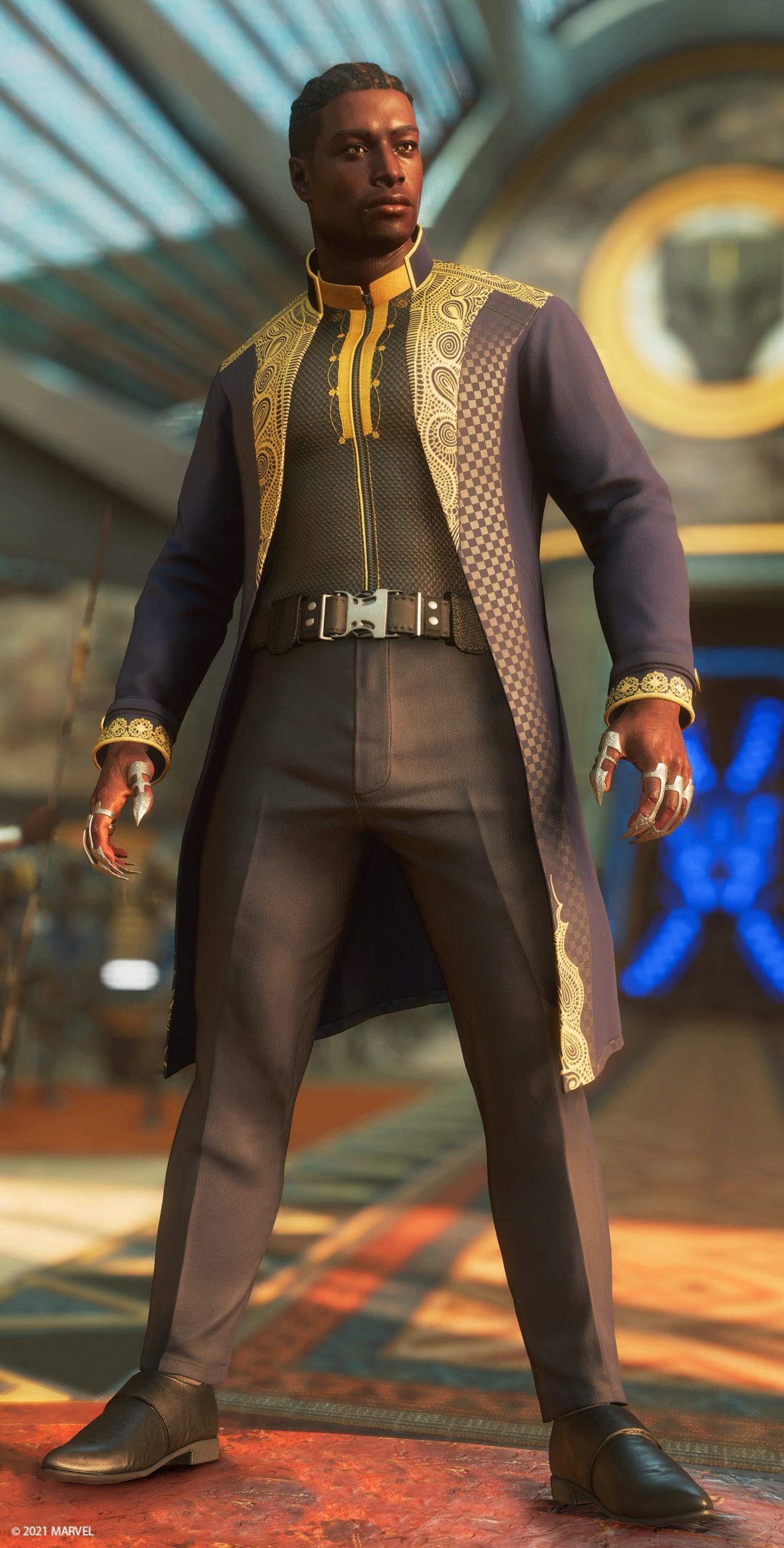 Black Panther alias T’Challa lässt mal das Outfit links liegen und zieht die königliche Robe ganz ohne Maske an. Das Aussehen soll zeigen, wie der König außerhalb des Anzugs seinen Tag bestreitet. Kämpfen kann er aber weiterhin, da er einfach Fingerringe mit Klauen im Kampf einsetzt.