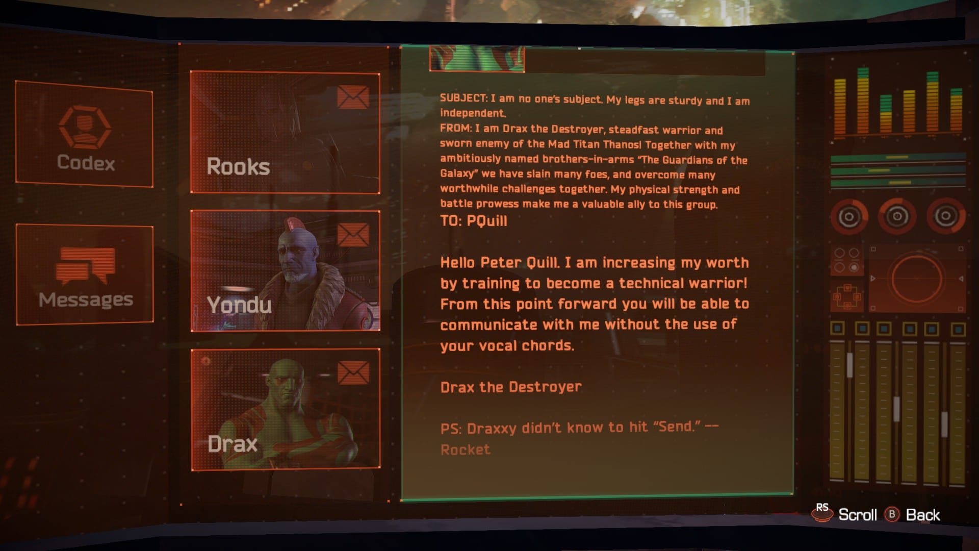 Nehmt euch die Zeit und lest euch im Cockpit der Milano die Mails durch, die Star-Lord bekommen hat. Mit diversen Easter Eggs und lustig verfassten Nachrichten werdet ihr für eure Neugier belohnt. Dafür wirken alle anderen Locations fast schon steril mit ihren wenigen Interaktionsmöglichkeiten, ihr werdet geradezu von einer Szene zur nächsten gescheucht.
