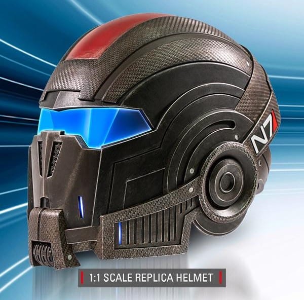 Der Helm leuchtet im Dunkeln: Das Highlight ist wohl der legendäre Atemgerät-Helm von Commander Shepard, der 1:1 nach dem 3D-Modell des Spiels erstellt wurde. Der tatsächlich tragbare Helm wurde dabei unter den wachsamen Augen der „Mass Effect“-Entwickler erschaffen und ist damit an Authentizität kaum zu übertreffen. Das Beste: Das Visier und die Akzente an Seiten und Rückseite leuchten wahlweise in vorbildlichen Blau oder im Rot der Abtrünnigen.