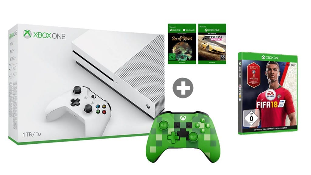 Auf der Webseite wird derzeit das sogenannte Microsoft Family Bundle angeboten, das aus einer Xbox One S 1 TB, einem Standard-Controller, einem zweiten Controller im Minecraft-Design sowie drei Spielen besteht. Bei den drei Spielen handelt es sich um Rares Piratenabenteuer Sea of Tieves, das Rennspiel Forza Horizon 2 sowie die Fußballsimulation aus dem Hause Electronic Arts FIFA 18. Insgesamt schlägt das Bundle mit günstigen 239 Euro zu Buche.