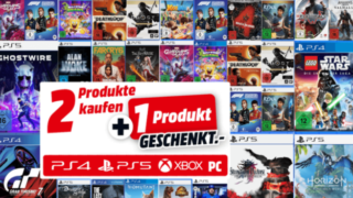 Mit der 3-für-2-Aktion bekommt ihr das günstigste von drei Spielen aus einem großen Sortiment geschenkt. Dabei müsst ihr euch auch nicht auf einen Typ festlegen, sondern könnt die Titel für PS4, PS5, Xbox Series X/S und PC frei untereinander kombinieren.