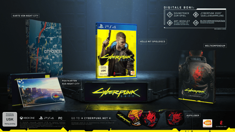 Die Day-1-Edition von Cyberpunk 2077 enthällt eine Karte von Night City, Postkarten aus Night City, ein Weltkompendium, Aufkleber und natürlich die Hülle mit den Spielediscs.