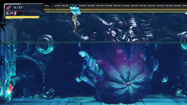 Der Tentakel ist die Schwachstelle: In der ersten Phase des Kampfes müsst ihr auf den Tentakel von Drogyga zielen, der sich direkt über den Gegner an der Decke des Raumes befindet. Schießt ihn mit Missiles oder Charge Beams ab. Glücklicherweise greift der Boss nicht so oft an wie andere Bossgegner im Spiel, sodass ihr ihm eigentlich gut einheizen könnt.