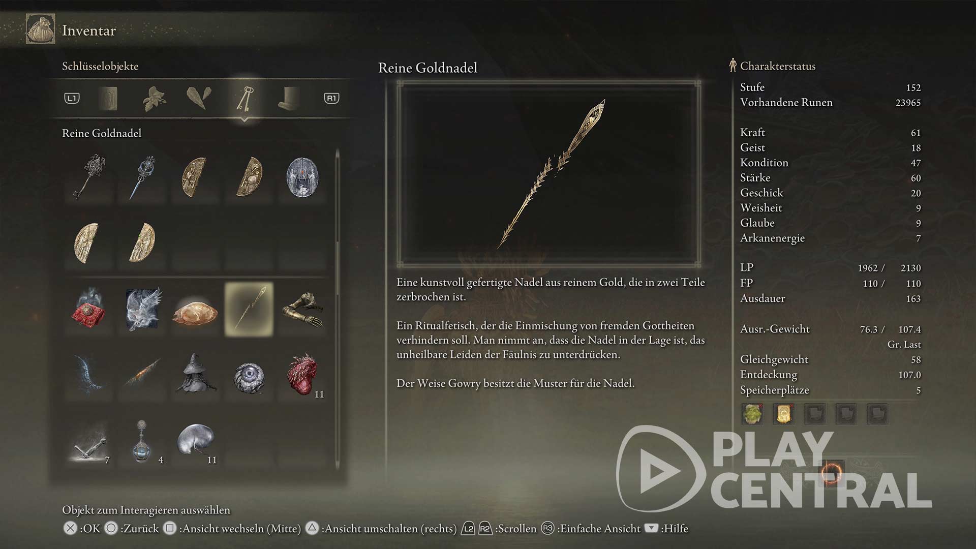 Nun geht es zurück zu Gowry, der den Gegenstand umgehend in Empfang nimmt und reparieren will. Ihr solltet zu einem späteren Zeitpunkt noch einmal wiederkommen. Beendet also das Spiel, indem ihr zurück ins Hauptmenü wechselt oder reist zu einem Ort der Gnade und kehrt dann zu dem NPC zurück. Sprecht jetzt wieder mit Gowry, damit ihr die reparierte Goldnadel erhaltet.