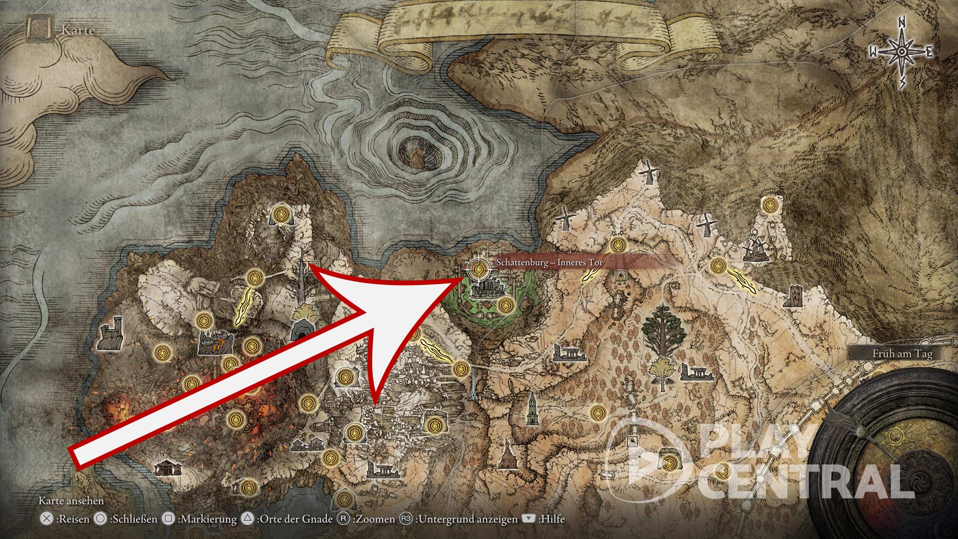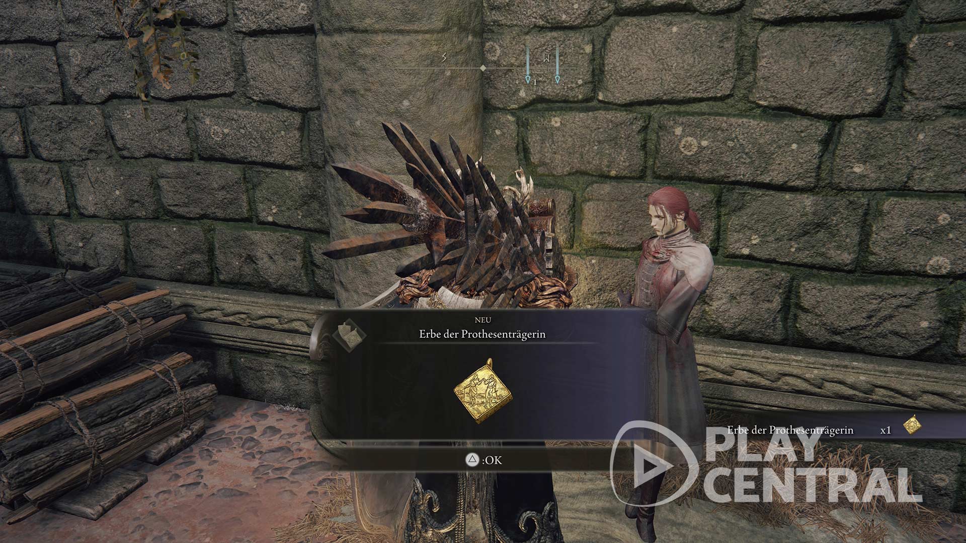 Die Prothese findet ihr in der Schattenburg. Reist also hoch in den Norden des Gebiets Altus-Plateau und kämpft euch dort durch die Burg. Im Nordwest-Flügel trefft ihr schließlich auf einen Soldaten, vor dem ihr euch in Acht nehmen solltet und der einen Raum bewacht. Darin steht eine Schatztruhe mit der gesuchten Walkürenprothese für Millicent.