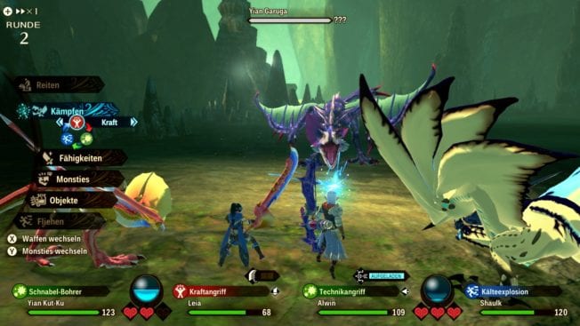 Ihr selbst steuert dabei ausschließlich eure Spielfigur und das dazugehörige Monstie – ein verniedlichender Begriff, der wie schon im ersten Teil für eure Kampfgefährten benutzt wird. Zu zweit kämpft ihr allerdings so gut wie nie. Stattdessen steht euch unter anderem mit Ajulia und Alwin so gut wie immer ein KI-Begleiter zur Seite, dessen Aktionen ihr nicht direkt beeinflussen könnt.