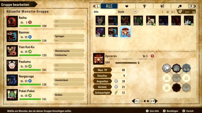 Damit ihr eure Monsties passend zum Gegner aufstellen könnt, empfiehlt es sich, eure Gruppe aus entsprechend verschiedenen Kategorien zu rekrutieren. Fünf dürft ihr mitnehmen (Platz 6 wird später automatisch vom Rathalosnachwuchs belegt) und in jeder Kampfrunde wechseln, ohne dass dabei ein Zug verloren geht.