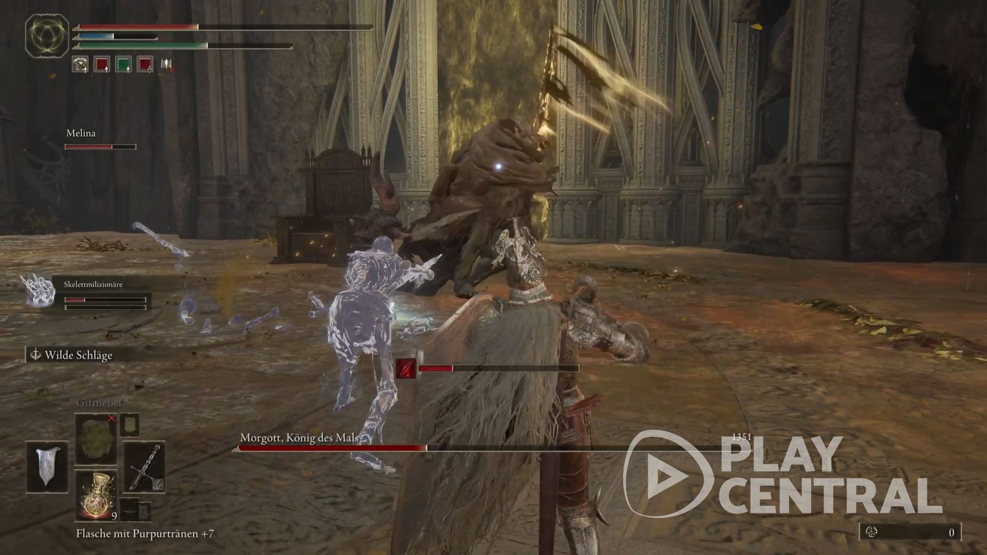 Ansonsten müsst ihr euch im Grunde auf keine neue Taktik einstellen, da sich das Angriffsverhalten von Morgott nicht signifikant von der ersten Phase unterscheidet. Lediglich die roten Klingen, mit denen er nun hantiert, sind neu. Wir müssen euch wohl nicht sagen, dass ihr euch davon nicht treffen lassen solltet. Passt außerdem auf, wenn der Boden an einigen Stellen brodelt, geht unbedingt auf Abstand.