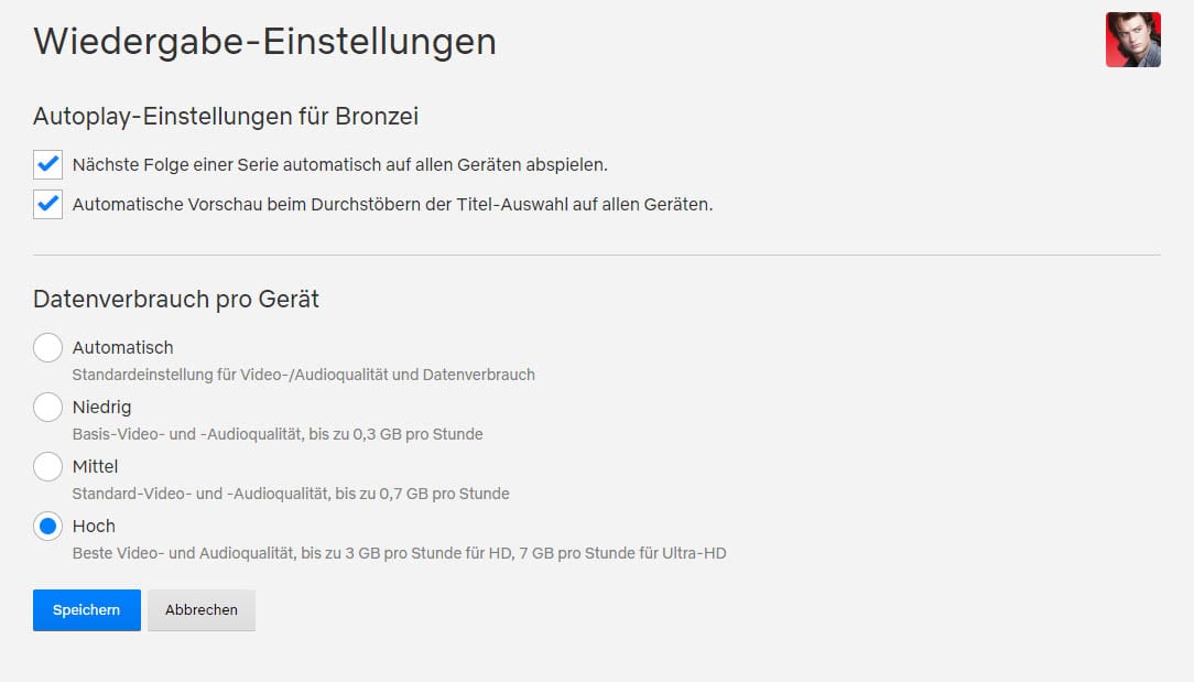 Bedenkt, dass die Übertragungsrate im Benutzerkonto eingestellt werden kann. Und zwar in den Wiedergabe-Einstellungen, wenn ihr euch mit eurem Profil einloggt. Ihr könnt wählen zwischen:
