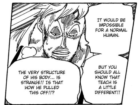 In Kapitel 966 sprechen Buggy und Shanks außerdem darüber, dass Blackbeard Gerüchten zufolge noch nie geschlafen hat. Auch Marco ist in Kapitel 577 bereits aufgefallen, dass Blackbeards Körper eine seltsame Struktur aufweist.