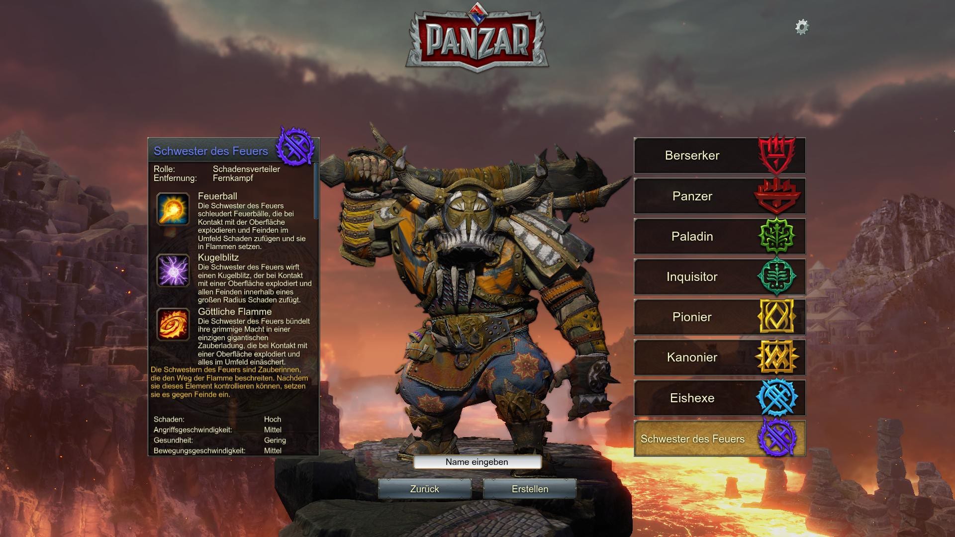 Panzer ist kein richtiges Online-Rollenspiel, aber auch nicht direkt eine MOBA, es ist eher eine Mischung, welche die Vorzüge aus beiden Bereichen miteinander mixt. Auf die inneren Werte kommt es an. Diesem Leitspruch folgt zumindest die Charaktererstellung von Panzar, die sich besonders kurz gestaltet. Statt eines gigantischen Menüs, in dem ihr euch erst eine Fraktion, danach eine Rasse und eine Klasse aussucht, um dann eure Gestalt von Achselhöhlenhöhe bis Zehennagellänge zu verändern, wählt ihr hier eine Klasse, womit auch eure Volkszugehörigkeit und euer Aussehen festgelegt sind. Dafür stehen euch in Panzar acht Klassen zu Verfügung. Die orkischen Panzer, die, wie der Name schon sagt, nahezu unzerstörbar sind und trotzdem mächtig austeilen; hammerschwingende Paladine, die neben dem Austeilen noch ihre Mitstreiter heilen und unterstützen; Zwergen-Pioniere, deren Maschinen im Kampf hilfreich sind; amazonische Schwestern des Feuers verfügen über magisch heiße Fernkampffähigkeiten; Inquisitoren stürzen sich aus dem Hinterhalt auf geschwächte Feinde, Ork-Berserker, deren Name sich wohl von selbst erklärt; Eishexen, die euch mit Frostzaubern die Glieder steif werden lassen und schließlich die Kanoniere, deren Geschütze mehr als zermürbend für Gegner sind.