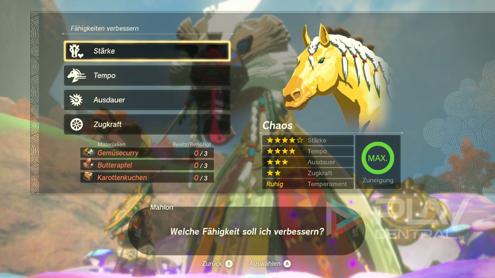 So verbessert ihr eure Pferde: Sprecht ihn dazu an und wählt die Gesprächsoption „Pferde stärken“. Nun seht ihr all eure registrierten Pferde, dessen Werte verstärkt werden können. Insgesamt gibt es bei Pferden vier Skills, die sich bei Mahlon verbessern lassen:
