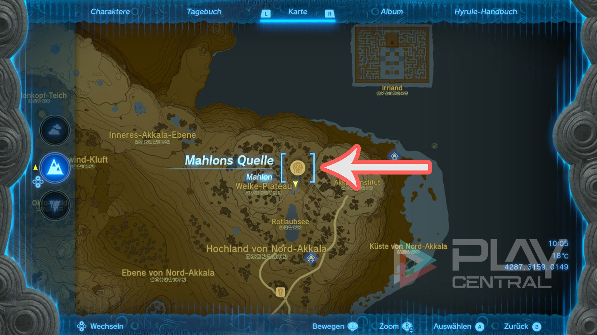 Fundort von Pferdegott Mahlon: Die Knospe des Gottes der Pferde (Mahlons Quelle) liegt ganz im Nordosten von Akkala im Hochland von Nord-Akkala und westlich vom Akkala-Institut. Davor befindet sich der Rotlaubsee. Die Knospe, in der Mahlon haust, unterscheidet sich in optischer Hinsicht nicht von denen der Großen Feen.