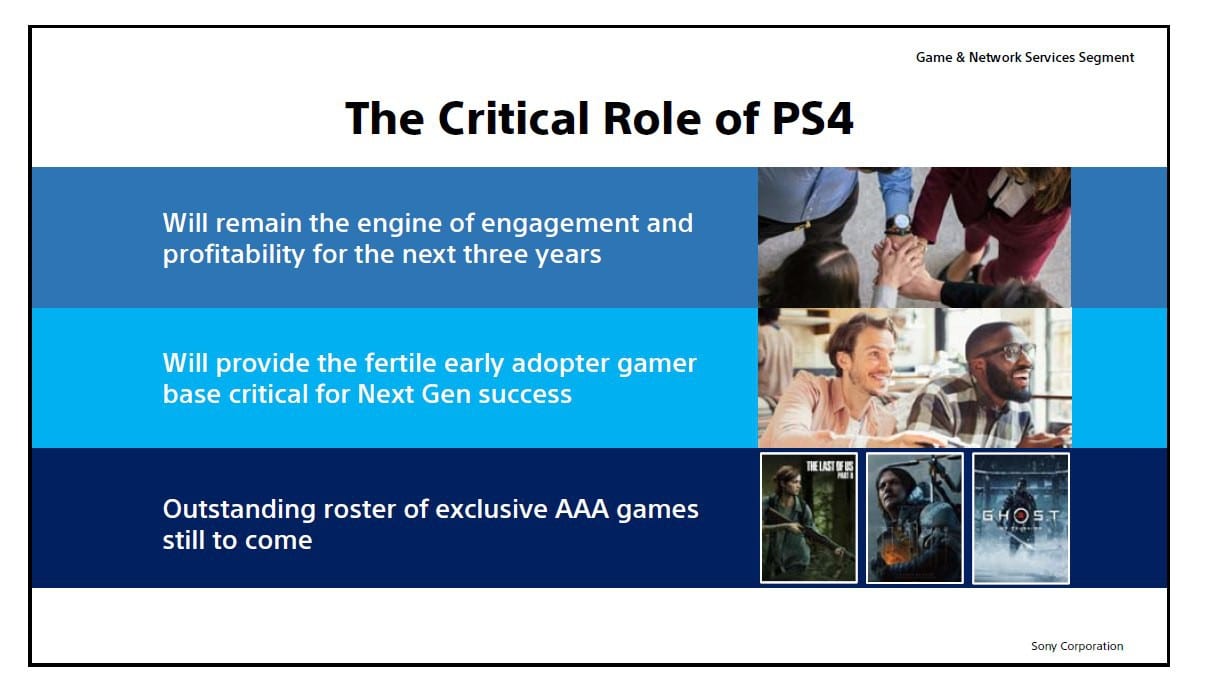Die PlayStation 4 bliebe auch in den kommenden drei Jahren der wichtigste Motor für Sony, heißt es in dem Dokument. Gleichzeitig gäbe es allerdings eine Menge Early-Adopter, die für den weiteren Erfolg der Playstation 5 kritisch sei. Dementsprechend sei die Abwärtskompatibilität der Next-Gen-Konsole ein wichtiger Faktor für Sony, um einen sanften Übergang zwischen den Generationen zu ermöglichen.