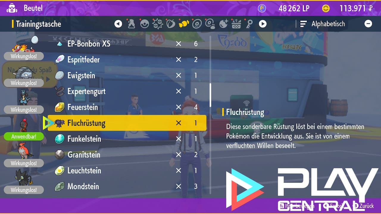 Nun bleibt nur noch der vierte und letzte Schritt übrig. Wählt im Menü den Beutel aus und klickt euch zur Glorienrüstung beziehungsweise Fluchrüstung durch. Klickt drauf und euch wird angezeigt werden, dass nur Knarbon in eurem Team mit diesem Objekt kompatibel ist. Danach wird es sich entwickeln.