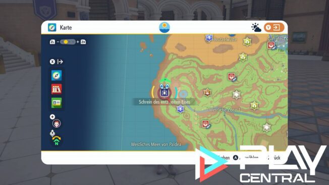 Nun kommen wir zu den gelben Pfählen, mit den Schrein des entzweiten Eises öffnen. Diesen findet ihr im Westen Paldeas, vom unteren Ende der Brutzelwüste aus gesehen ein kleines Stück südwestlich. Sobald ihr diesen Schrein öffnet, erscheint das legendäre Unheil-Pokémon Baojian (Level 60) vor euch.