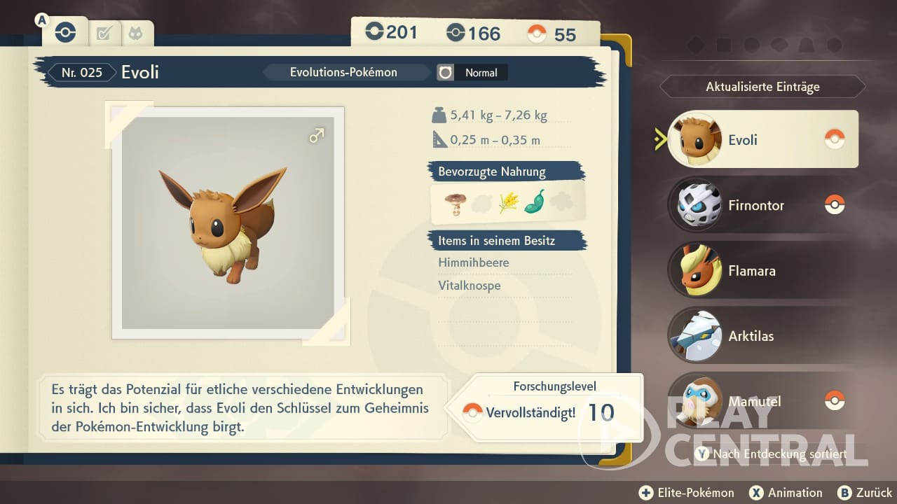 Des Weiteren gibt es für viele Aufgaben mehrere Stufen. Ihr erhaltet also auch Forschungspunkte, wenn ihr eine bestimmte Vorgabe mehrfach wiederholt. Welche Aufgaben ihr genau abhaken müsst, um für einen Eintrag das Forschungslevel 10 zu erreichen, ihn also abzuschließen, verrät euch der Pokédex. Ihr werdet übrigens regelmäßig vom Spiel dazu gebracht, euren Fortschritt zu aktualisieren. Immer wenn ihr nach Jubeldorf zurückkehrt, müsst ihr Professor Laven euren Pokédex zeigen.