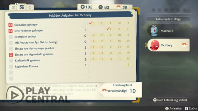 Wenn ihr nicht viele Octillery findet, gibt es eine einfach Möglichkeit, schnell den Forschungseintrag auf Stufe 10 zu bekommen. Ein Blick auf die Pokédex-Aufgaben bringt uns nämlich auf eine fixe Idee.