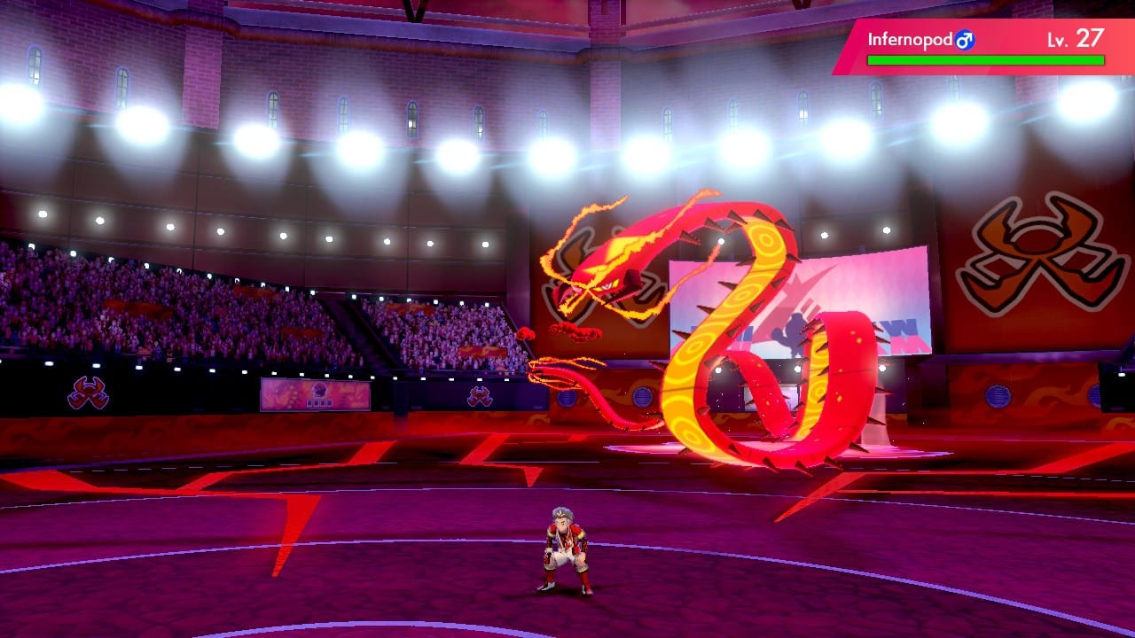 Zum Schluss versucht es Kabu mit dem Pokémon Infernopod (Feuer, Käfer). Dieses Wesen erhält durch Attacken vom Typ Wasser und Flug doppelten schaden, durch Gestein sogar Vierfachen. Verzichtet selbst auf Kämpfer vom Typ Pflanze, Eis, Kampf, Käfer, Stahl oder Fee, da diese im Nachteil sind. Setzt in diesem Kampf auf Gigadynamax, schließlich wird es Kabu genauso tun.