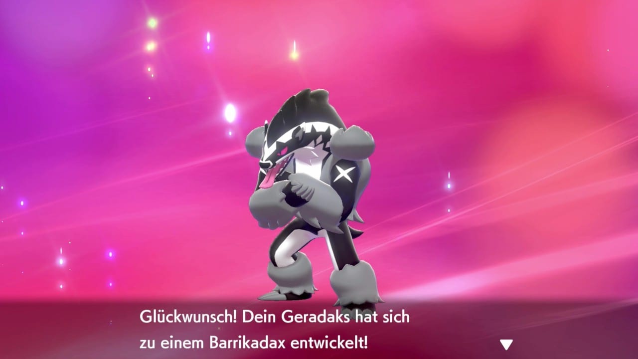 Ofizielle Beschreibung: Die Geradaks der Galar-Region leben in rauen Verhältnissen und müssen sich gegen die harte Konkurrenz ihrer Artgenossen durchsetzen. Ihr Selbsterhaltungstrieb ist deshalb besonders stark ausgeprägt, was schließlich dazu führte, dass sie sich zu Barrikadax entwickelten. Obwohl Barrikadax sehr kampflustig ist, scheint es nur selten als Erstes anzugreifen. Es provoziert seinen Gegner, um ihn dazu zu verleiten, in die Offensive überzugehen. Gelingt ihm dies, formt es mit den Armen ein „X“ und fängt den Angriff mit seiner Attacke Abblocker ab. Barrikadax ist besonders talentiert darin, Gegner unachtsam werden zu lassen und dann mit seinen scharfen Krallen einen Gegenangriff zu starten.