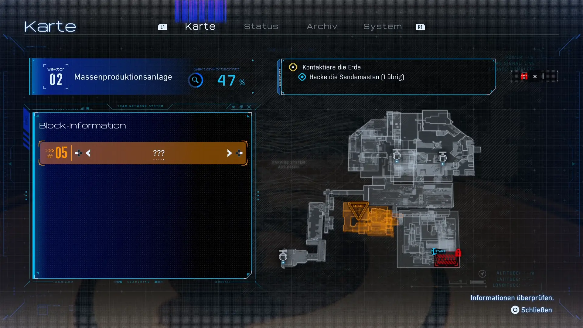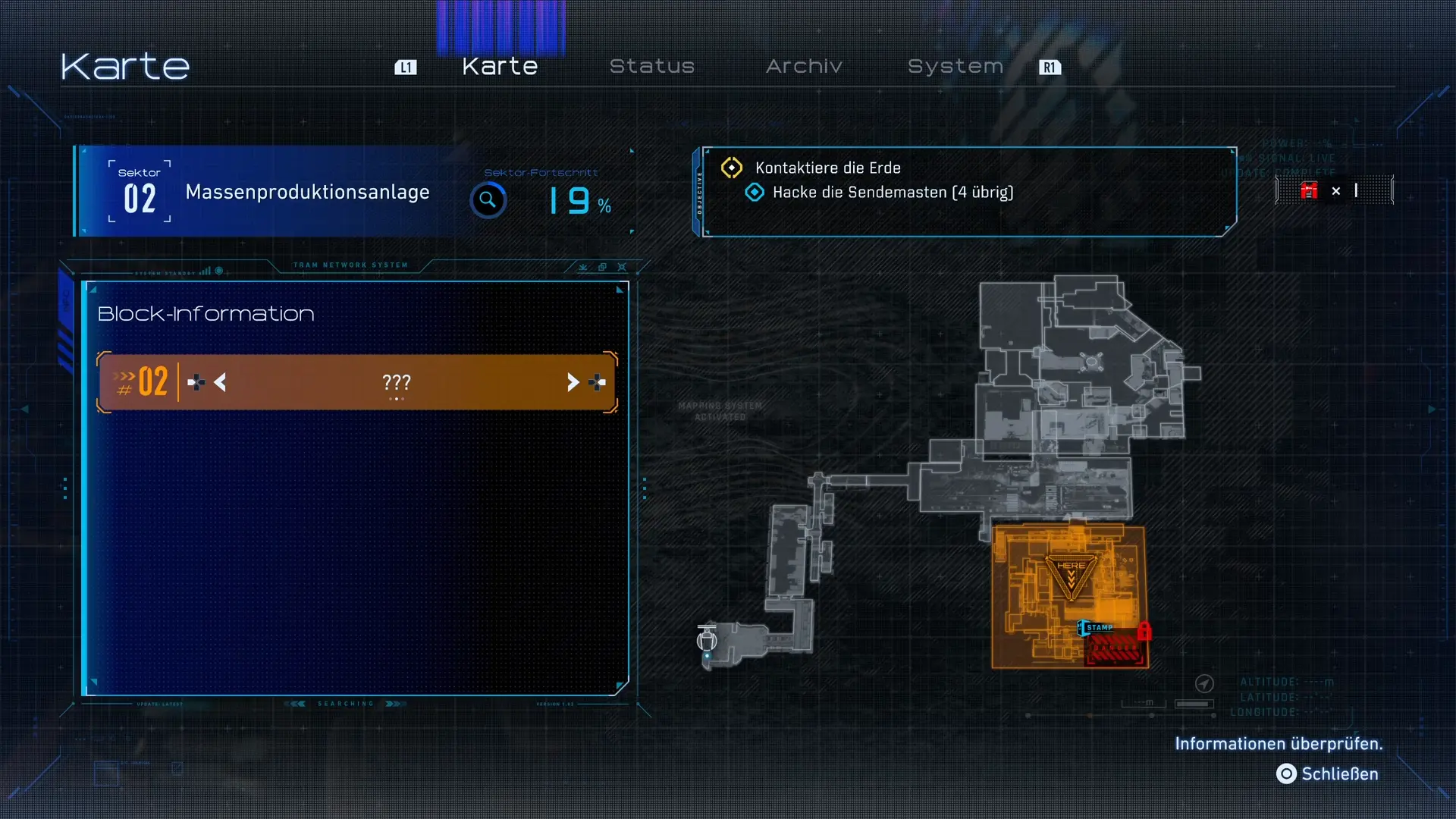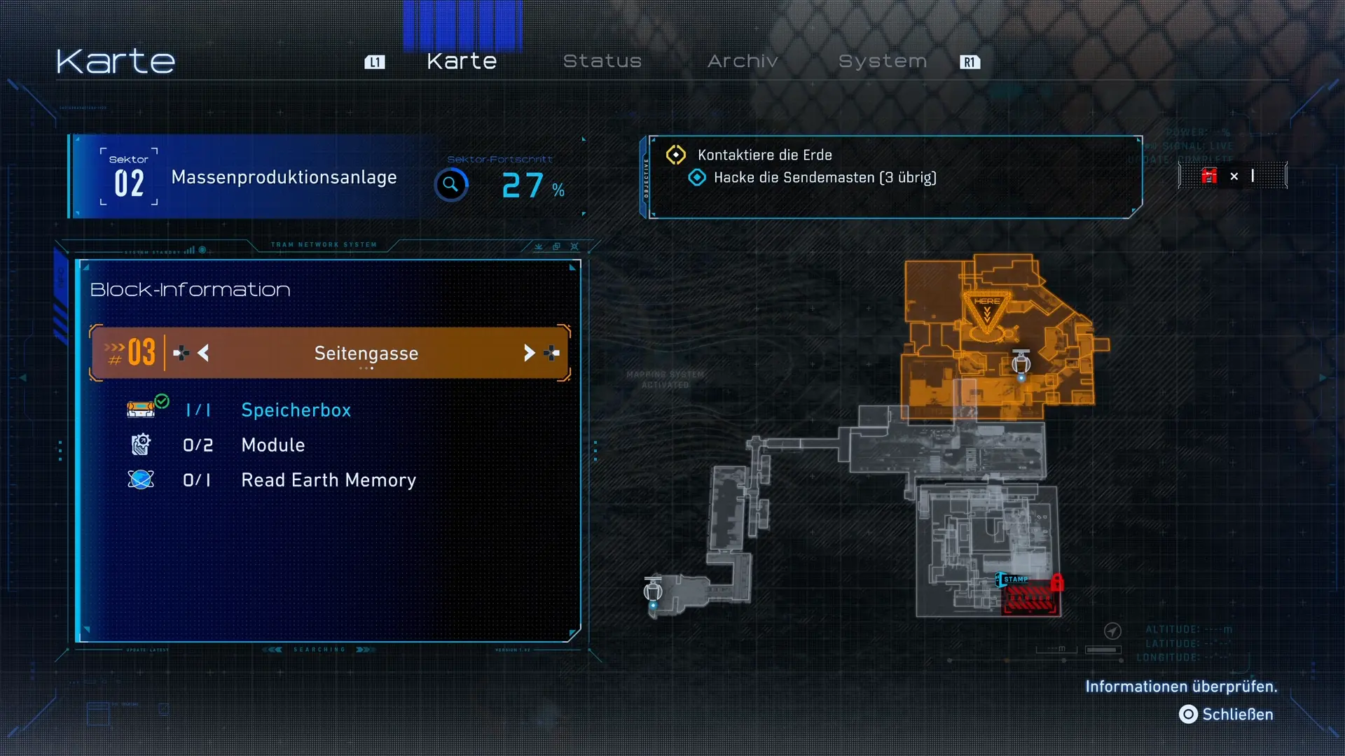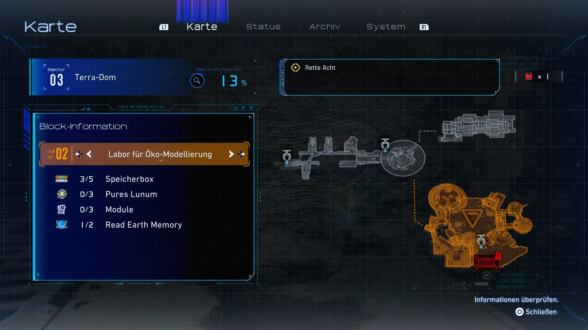 Schaukel (Sektor 03, Terra-Dom, GeoScience-Labor): Reise zunächst zur Bahnstation GeoScience-Labor in Block 04 und nutze den Aufzug direkt daneben, um nach oben zu gelangen. Dort deaktiviert du den Signalstörer und öffnest anschließend die Tür daneben per Hack.
