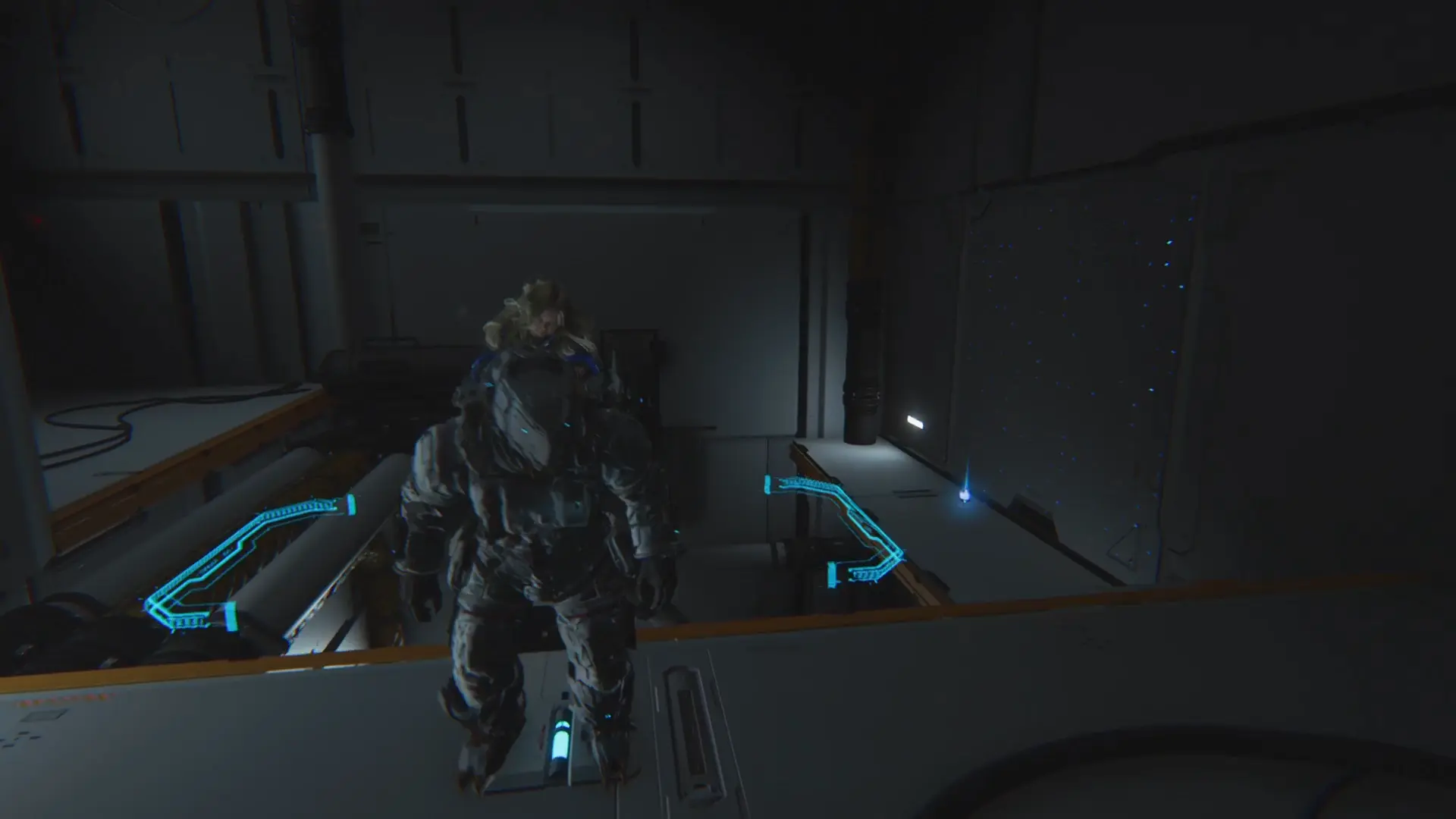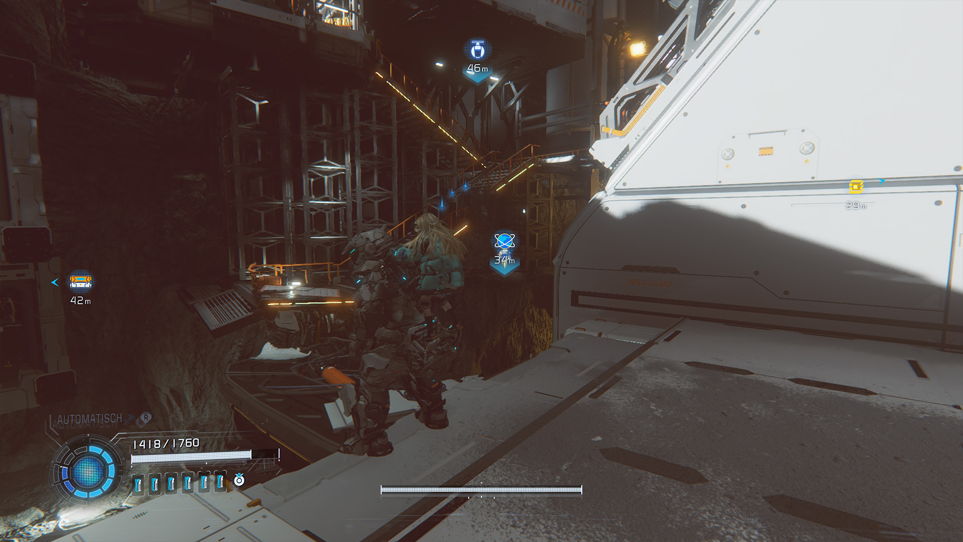 Oben angekommen gehst du vorsichtig nach rechts über den schmalen Vorsprung. Pass hier gut auf, da du leicht herunterfallen kannst. Am Ende des Weges findest du eine Holo-Wand. Sobald die Interaktion angezeigt wird, kannst du sie aktivieren, wodurch die Wand verschwindet.