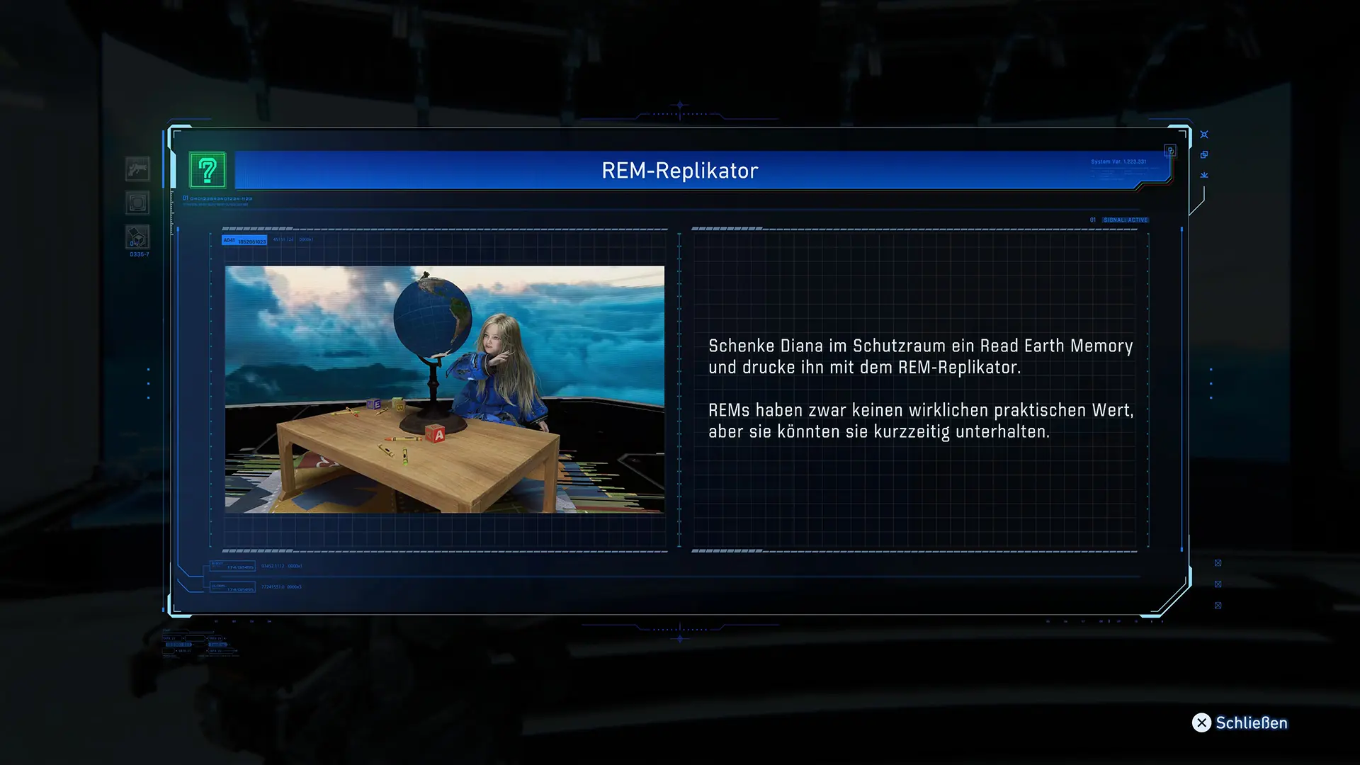 Was passiert, wenn du ein REM einsammelst? Jedes gefundene REM belohnt dich mit einem Geschenk für Diana. Zurück im Schutzraum kannst du es ihr überreichen. Daraufhin wird es durch einen REM-Replikator gedruckt und erscheint somit als spielbares Element.