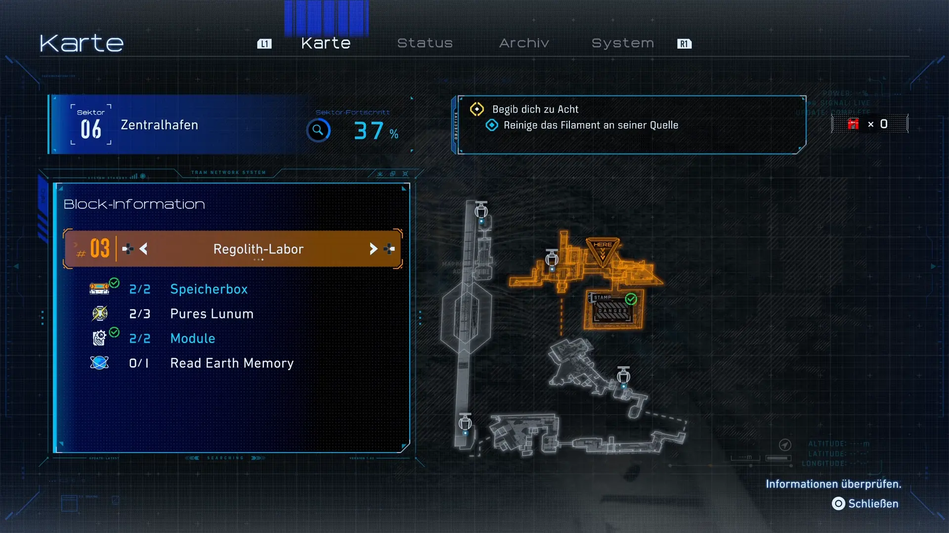 Wasserpistole (Sektor 06, Zentralhafen, 03, Regolith-Labor): Während du dich im Zentralhafen mit der toten Materie herumschlägst solltest wieder besonders aufmerksam sein. Denn im Regolith-Labor gibt es die letzte Holo-Wand (siehe Bild).