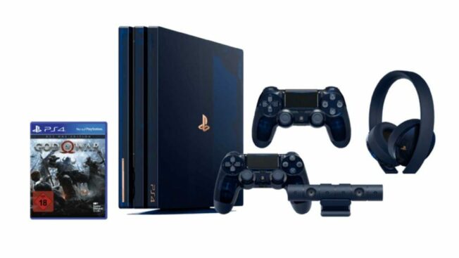 Im Inneren der dunkelblauen, transparenten PS4 Pro steckt eine 2 Terabyte große Festplatte und eine kupferfarbene Platte mit einzigartiger Seriennummer auf der Vorderseite. Weiterhin befindet sich im Lieferumfang ein zum Design passender DualShock 4 Wireless-Controller, eine PlayStation-Kamera, ein vertikaler Standfuß sowie ein Mono-Headset. Außerdem dürfen sich Käufer über den sehr guten PS4-exklusiven Action-Adventure-Hack- und Slash-Titel God of War freuen.