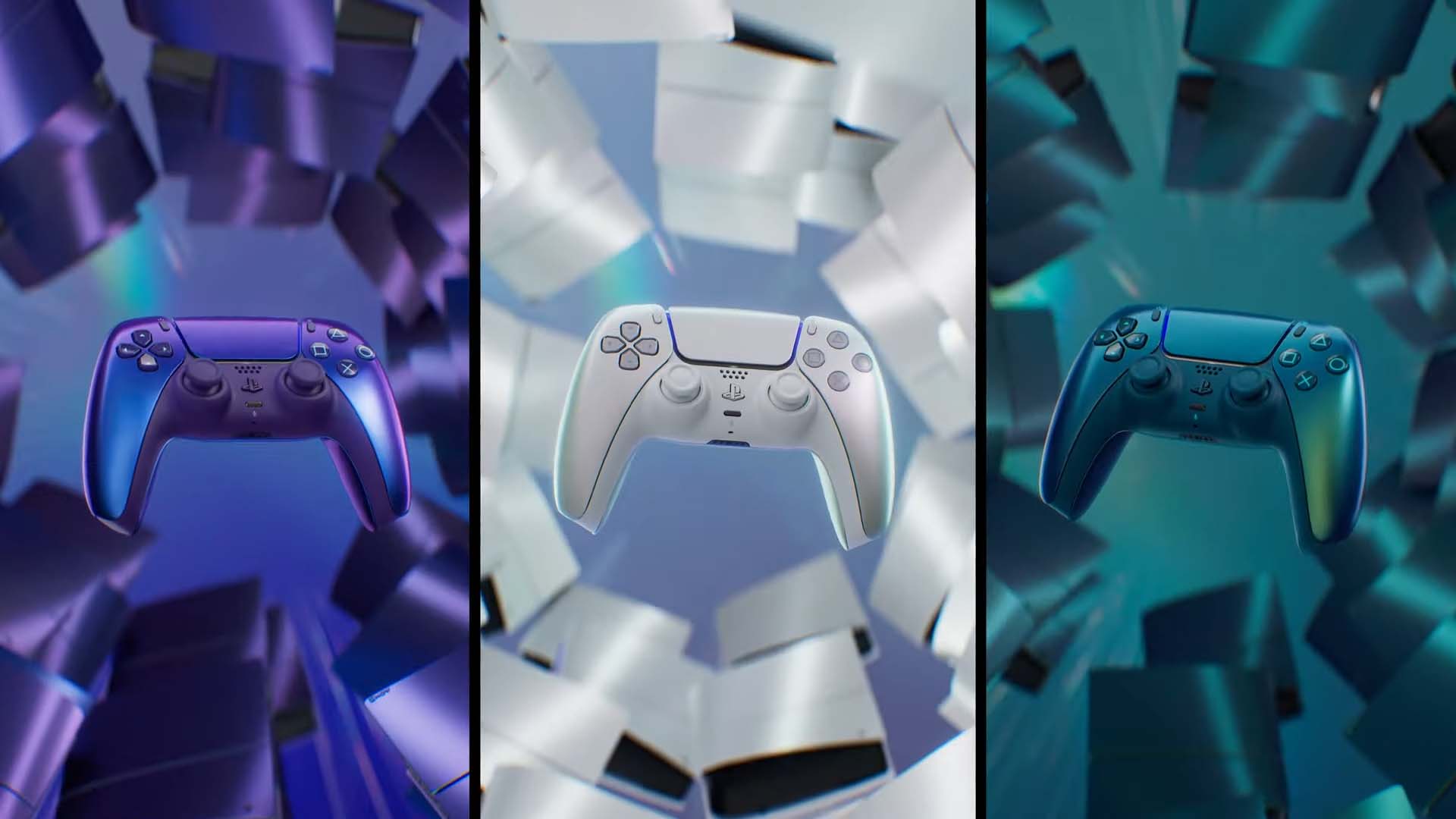Es ist wirklich eine ganz neue Ästhetik, die die PS5 hier spendiert bekommt. Die Kollektion umfasst neue Designs für die PlayStation 5-Konsolen, PS5-Konsolen-Cover und die DualSense Wireless Controller. Es gibt insgesamt drei neue Designs, die schimmern und dabei ihre Farben wechseln.