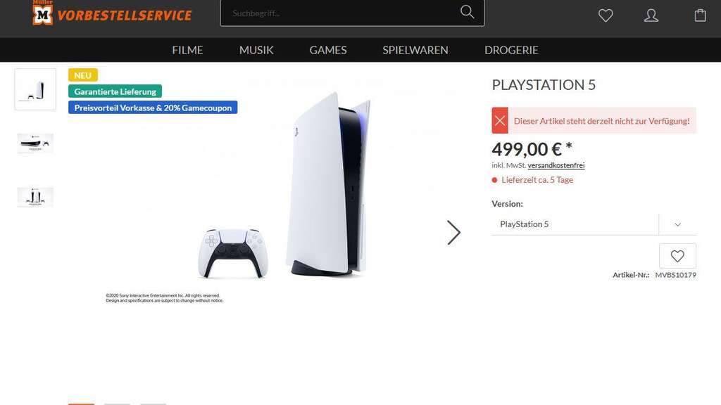 Doch mit der Drogeriekette Müller hat nun ein weiterer Onlineshop einen vermeintlichen Hinweis auf den Preis geliefert. Über den Vorbestellerservice konnte der Preis in Höhe von 499 Euro für die Disc-Version bei Müller eingesehen werden. Als Lieferzeit werden fünf Tage angegeben.