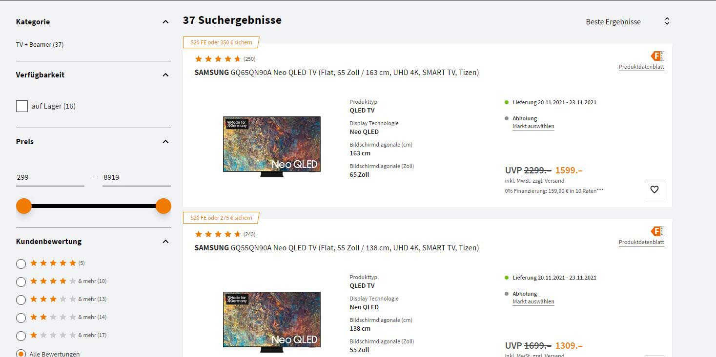 - Samsung QN85A mit 75 Zoll für 2.479 Euro