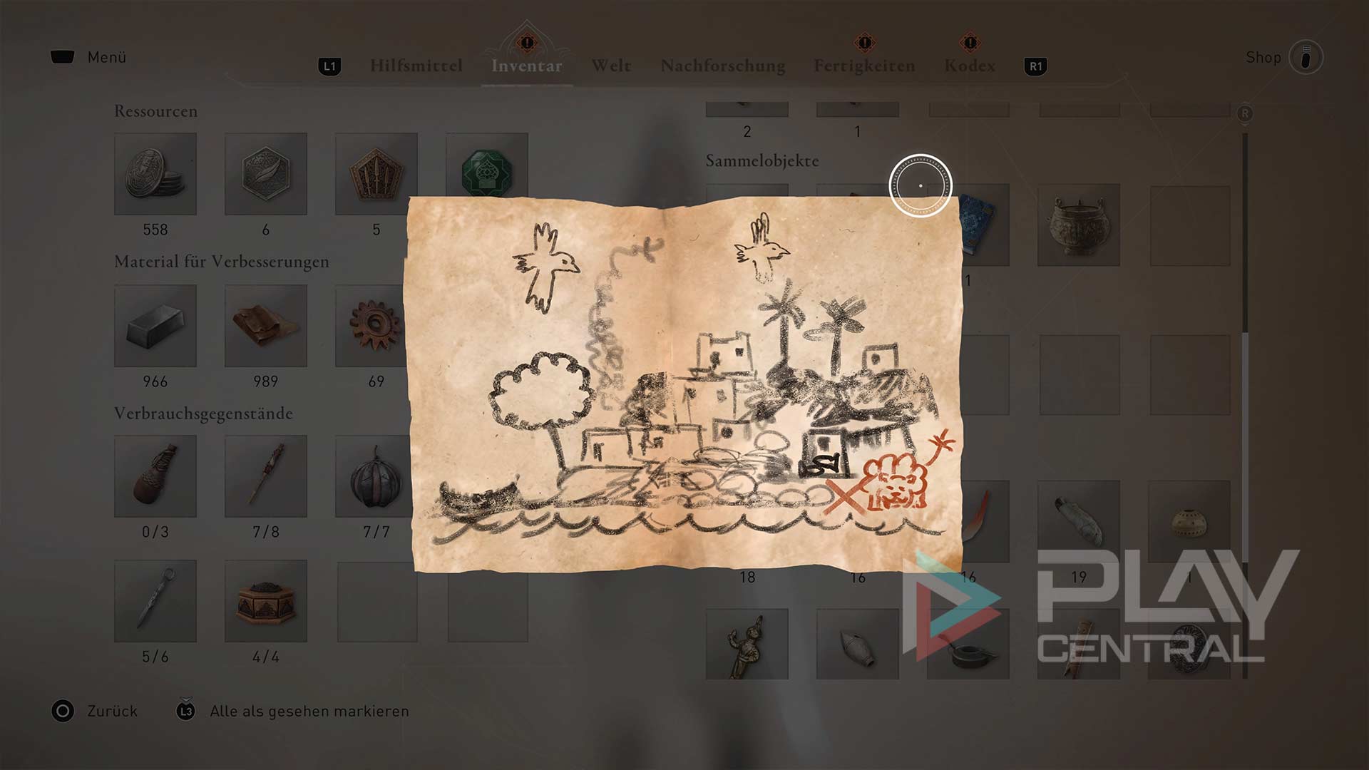 Wechsel nun in euer Inventar und klickt auf die Tasche. Scrollt auf der rechten Seite ein Stück nach unten, bis ihr die Kategorie Rätsel findet. Wählt hier die zuvor aufgenommene Zeichnung aus, um sie anzuschauen. Darauf abgebildet ist anscheinend ein Dorf, das sich an einem Gewässer befindet. Außerdem ist ein Löwenkopf in der unteren rechten Ecke zu erkennen.