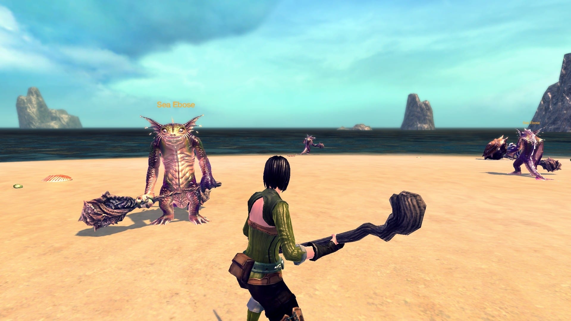 Anfangs sind die Quests natürlich noch sehr leicht gehalten. Einer der ersten Wege führt uns zum Strand, wo wir gegen Riesenkrabben und Fischungeheuer antreten. Klingt jetzt schlimmer als es ist. Schnell merken wir, dass manche Gegner nach dem Kampf kleine Bonis zurücklassen. So können wir für ein paar Sekunden die riesigen Keulen der Fischmonster benutzen, welche viel mehr Schaden machen als unsere Waffe.