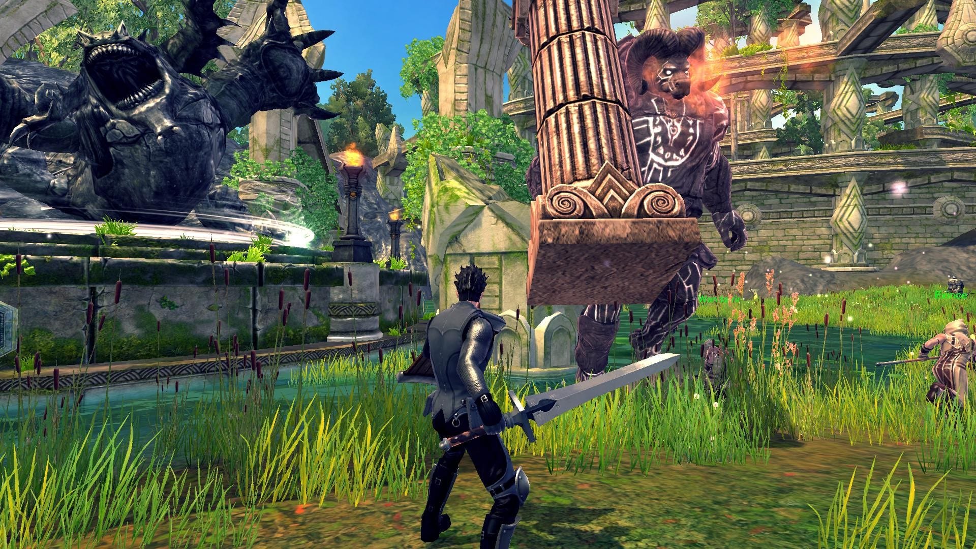 Hauptaugenmerk bei RaiderZ liegt aber ganz klar auf dem Kampf gegen böse Monster. Diese werden auch schon sehr früh im Spiel recht groß. Siehe diese zum Leben erwachte Steinstatue hier. Um das Ding in die Knie zu zwingen, sind schon ein paar mehr Spieler nötig.