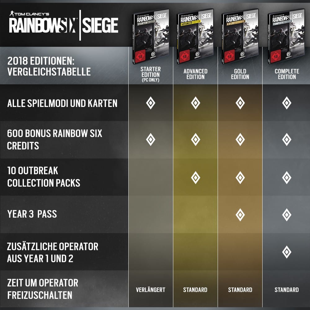 - Starter Edition, 15 Euro: Exklusiv für PC, unbegrenzter Zugriff auf Modi und Karten, 600 R6-Credits, mehr Ansehen zum Freischalten von Operatoren benötigt.
