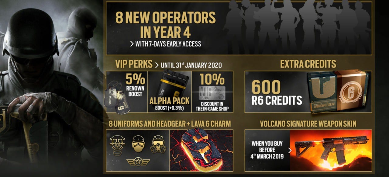 Wer sich noch vor dem 04. März 2019 den Year 4 Pass sichert, darf sich über ein einzigartiges Vulkan-Signatur-Waffen-Design als Belohnung freuen. Besitzer des Year 3 Pass erhalten 600 Rainbow Six Credits als Belohnung.
