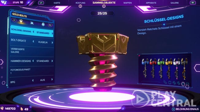 Jeder Gold-Bolt schaltet ein neues Extra frei: Mit jedem gesammelten Gold-Bolt erhaltet ihr Zugriff auf einen weiteren Cheat oder Bonus in der Liste. Das geht chronologisch vonstatten. Ihr müsst also alle 25 Gold-Bolts gefunden haben, um die Waffen zu vergolden. Es lohnt sich, nach jedem gesammelten Gold-Bolt nachzusehen, was ihr Neues an Extras freigeschaltet habt.