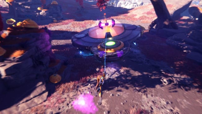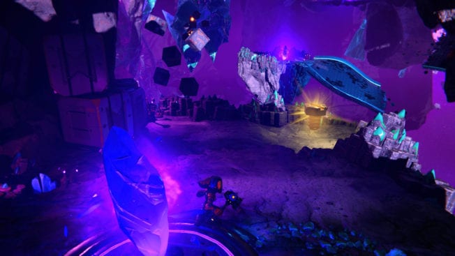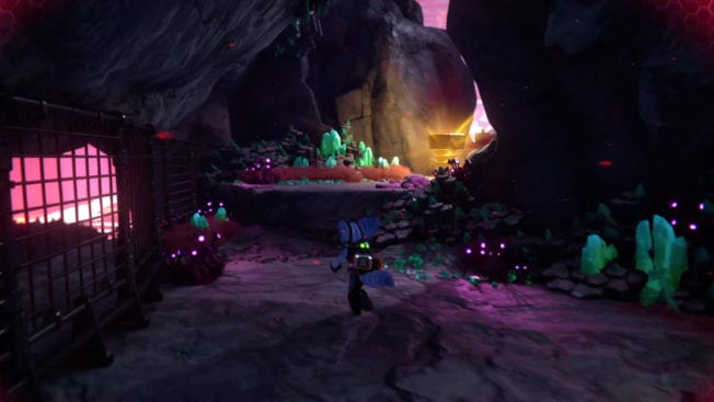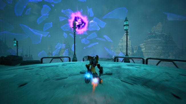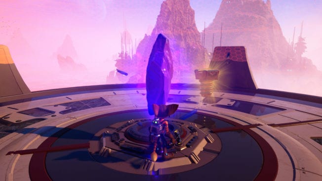 Aktiviert den Blizar-Kristall auf der obersten Ebene der Hauptplattform, sodass ihr zur vereisten Dimension wechselt. Rutscht hinunter zur Hauptebene. In der Ferne seht ihr eine Plattform mit einem Blizar-Kristall. Beschleunigt mit den Hoverstiefeln und springt zur Plattform (mit Spaltstrahler zum Dimensionsriss ziehen). Schlagt auf den Blizar-Kristall, um in die normale Dimension zu wechseln, sodass ihr euch unter einer Holokuppel zusammen mit dem Gold-Bolt befindet.