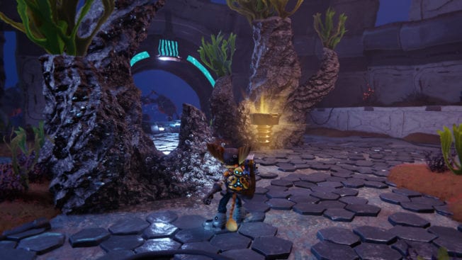 Seid ihr in der Unterwasserpassage kommt ihr recht früh an eine senkrechte Wand entlang, die ihr mit den Magnetstiefeln erklimmen könnt. Oben angekommen, wartet der Gold-Bolt auf euch.