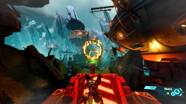 Flitzt mit den Hoverstiefeln über die Sprungschanze am Plündermarkt und gelangt so zum Flitzkäfer. Mit dem Flitzkäfer fahrt ihr durch den Feuerring und biegt dann direkt rechts ab und springt über eine Schanze, die euch zu einem Schanzenparcours mit zwei weiteren Feuerringen bringt. Überwindet diesen und haltet euch geradeaus, um direkt auf eine Insel mit dem Spionbot zuzusteuern.