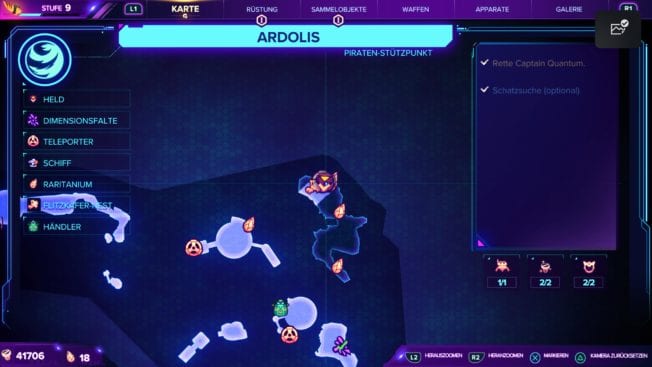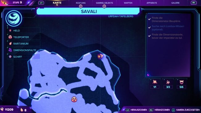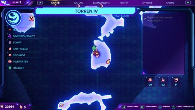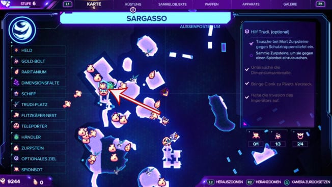 Es gibt auf Sargasso eine Nebenmission, in der ihr mit dem Flugsaurier Trudi herumfliegen könnt und Zurpsteine finden müsst. Sprecht mit Mort, um die Mission zu aktivieren (siehe Pfeil auf der Karte). Die Nebenmission ist in zwei Parts unterteilt. Zuerst geht’s um Schutztruppenstiefel. Habt ihr die nötige Anzahl Zurpsteine für die Ausrüstung beisammen, gibt’s als nächsten Preis den Spionbot. Dafür müsst ihr sämtliche 60 Zurpsteine auf der Karte sammeln.