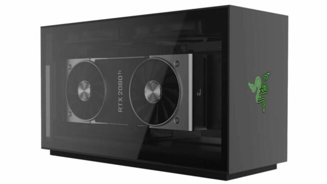 Um die GPU im Inneren in all seiner Pracht zu präsentieren, besteht das Aluminium-Gehäuse auf beiden Seiten aus gehärtetem Glas. An der oberen Seite wurden Entlüftungsöffnungen angebracht, um eine effiziente Kühlleistung zu garantieren, außerdem bietet die Rückseite ein einfach zu verriegelndes Schubfach, damit ohne Werkzeuge auf die inneren Komponenten zugegriffen werden kann. Zur Größe des Gehäuses konnte sich Razer noch nicht äußern, doch wird vermutet, dass es, wenn überhaupt, nur geringfügig größer ist als das eGPU-Gehäuse Core X (Chroma).
