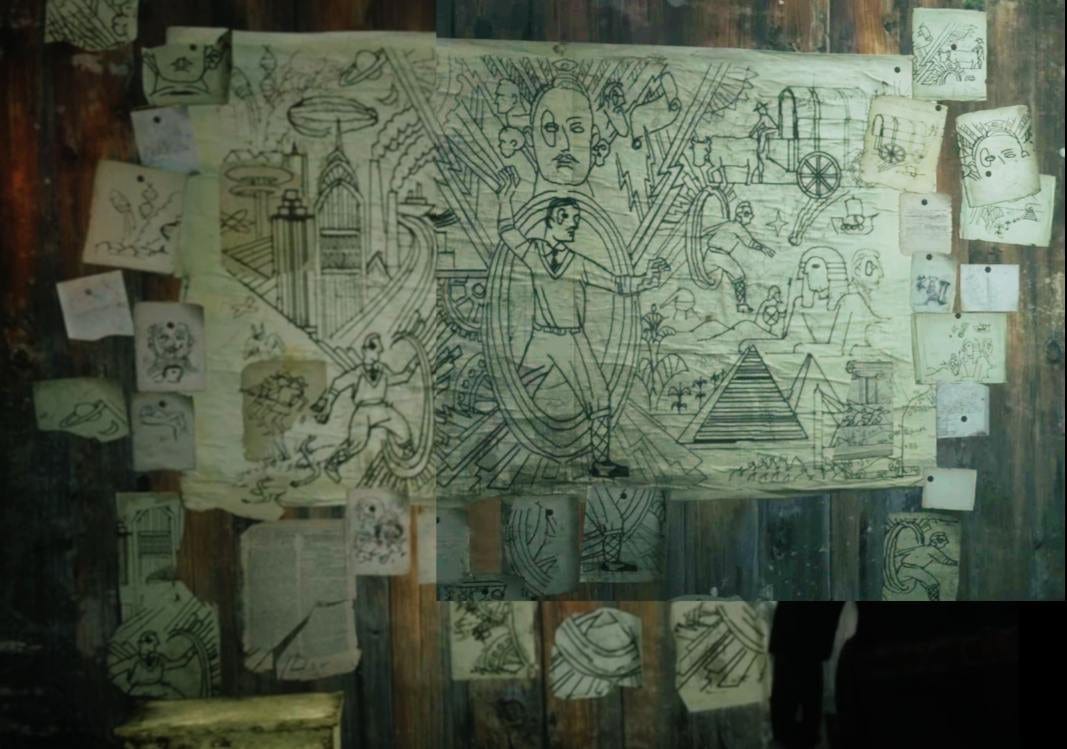 Auf der linken Seite seht ihr gewaltige Hochhäuser, während ihr rechts die Pyramiden von Gizeh und die Sphynx ausmachen könnt. Im Zentrum der Kollage hingegen ist ein Bild von einem Mann mit einem seltsamen Muttermal, der durch verschiedene Portale schreitet.